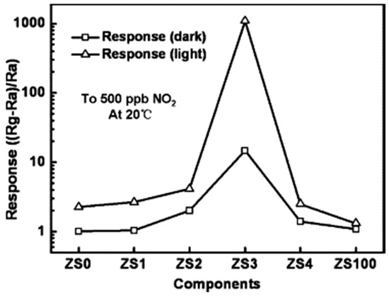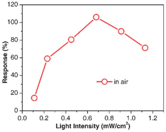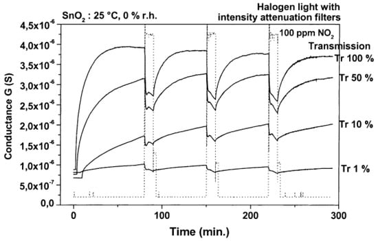Conductance response of SnO2 towards 100 ppm NO2 under different light intensities. Reproduced with permission from [50].
