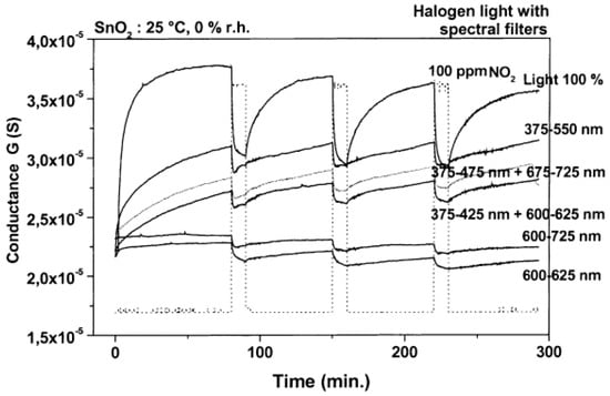 Conductance response of SnO2 towards 100 ppm NO2 with illumination at different wavelengths. Reproduced with permission from [50].