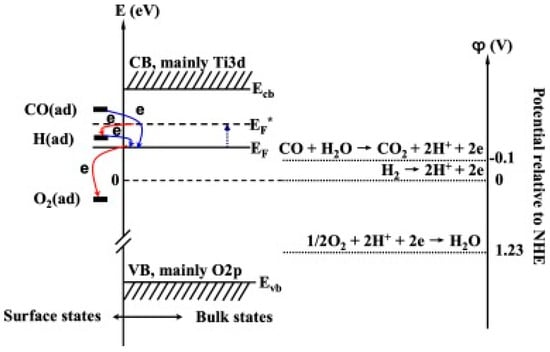 Schematic energy level characterizing the surface and bulk electronic states of TiO2, as well as the oxidation potential value of CO and H2. The adsorption of H2 causes the elevation of Fermi level (from EF to EF* (a quasi-Fermi level)) under UV irradiation, resulting in H2 accepting electrons from TiO2, while CO still donate electrons to TiO2. Reproduced with permission from [52].
