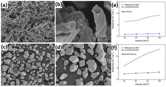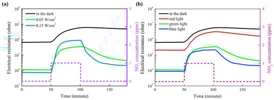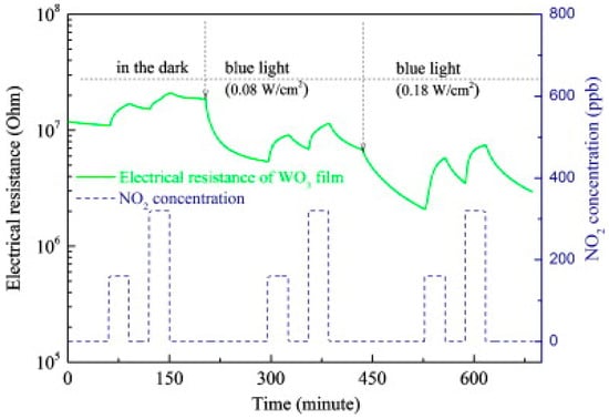 In recent years, WO3 has attracted increasingly attention for gas sensing applications [54,55,56]. Under visible light illumination, WO3 exhibited enhanced sensing response and faster sensing ratio to NO2 as compared to the case without photons, and the sensing response increased with the light intensity, as reported by Zhang [56] (Figure 19). It was also shown that the sensing was influenced by light wavelength and humidity. The blue light at λ = 480 nm resulted in fasted sensing speed.