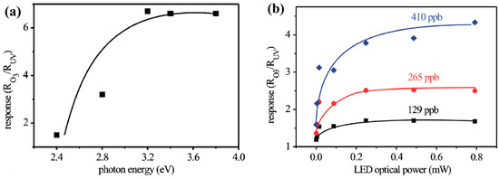 O3 sensing response vs. (a) photon energy; (b) LED light power. Reproduced with permission from [57].