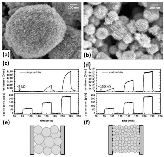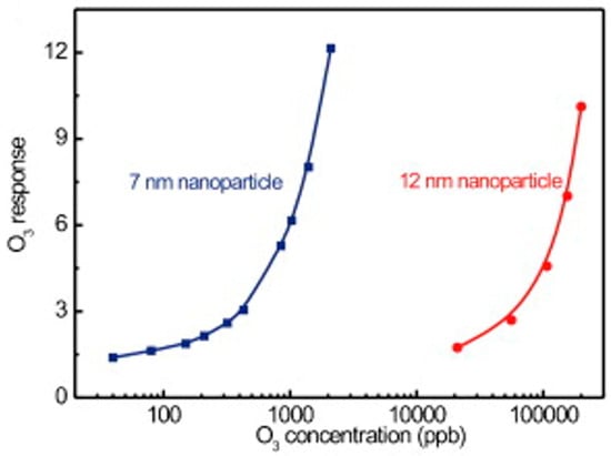 O3 response vs. size of In2O3 nanoparticles. (blue line) 7 nm and (red line) 12 nm. Reproduced with permission from [58].