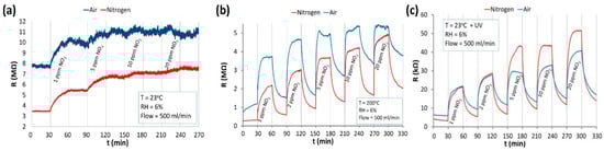 NO2 sensing of ZnO nanostructures in different atmospheres of synthetic air and nitrogen at: (a) room-temperature (RT); (b) elevated temperature of 200 °C; (c) RT and UV irradiation. Reproduced with permission from [44].