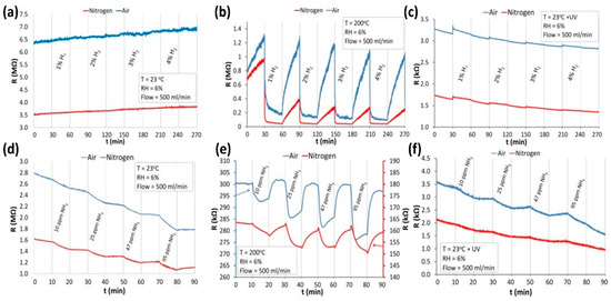 H2 sensing of ZnO nanostructures in different atmospheres of synthetic air and nitrogen: (a) RT; (b) evaluated temperature of 200 °C; (c) RT and UV irradiation. NH3 sensing of ZnO nanostructures in air and nitrogen: (d) RT; (e) 200 °C; (f) RT and UV irradiation. Reproduced with permission from [44].
