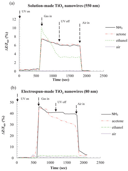 The sensing characteristics are dependent on the size of the nanostructures. For 1D nanostructures, the diameter became the most important. Wang fabricated TiO2 nanowires with two different methods: ethylene glycol-mediated hydrolysis and high-voltage electrospinning. They compared their sensing response towards NH3, acetone and ethanol at room temperature with UV irradiation. It was found that the TiO2 synthesized with electrospun exhibited higher response than the one synthesized with solution method (Figure 24). They thought this might be due to the fact that colloidal TiO2 nanowires could still contain Ti(OH)m on the surface which would decrease the sensing property because the solution-made TiO2 nanowires were fabricated in NaOH solution. However, it was also very possible that the effect was attributed to the smaller diameter of the electrospun-made TiO2 nanowires, i.e., 80 nm, and the diameter of the one made from a hydrolysis approach was 550 nm (Figure 25) [60].