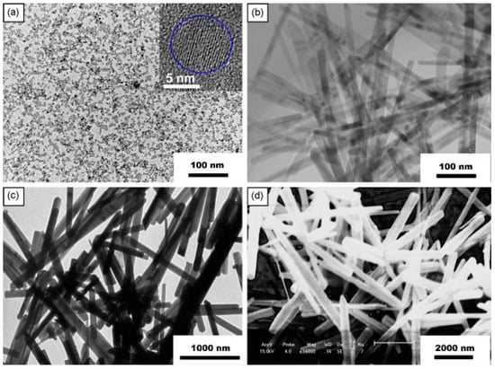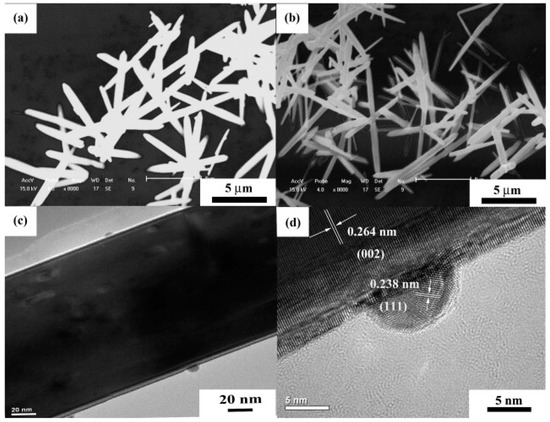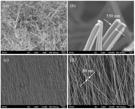 Scanning electron microscopy (SEM) images of TiO2 nanowires made from hydrolysis (a,b) and from electrospinning (c,d). Reproduced with permission from [60].