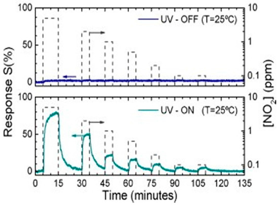 Dynamic NO2 sensing curve of an individual SnO2 nanowire, operating in dark and UV illumination at room temperature (T = 25 °C). Dashed lines indicate the NO2 concentration. Reproduced with permission from [39].