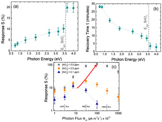 (a) Sensor response and (b) recovery time of the nanowire device towards 0.5 ppm NO2 in air under illumination with different photon energies and constant photon flux; (c) Sensor response of three different concentrations of NO2 under illumination with different photon flux levels (Eph = 3.67 ± 0.05 eV). Reproduced with permission from [39].
