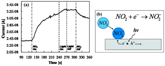 (a) The effect of light irradiation on the dynamic response of CuO nanowire (NW) sensor to 100 ppm NO2 at room temperature; (b) Proposed mechanism. Reproduced with permission from [61].