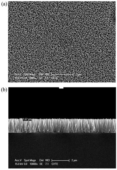 SEM images of ZnO nanorods (a) top view and (b) cross sectional view. Reproduced with permission from [12].
