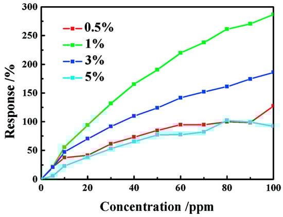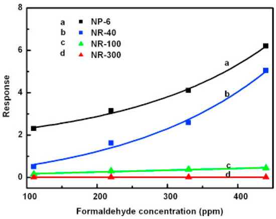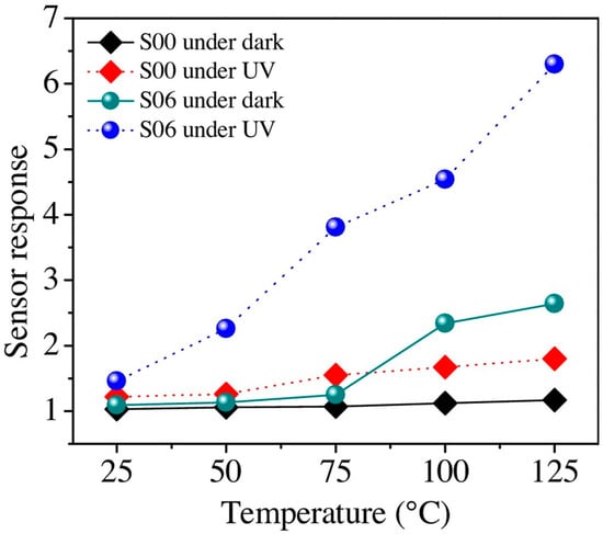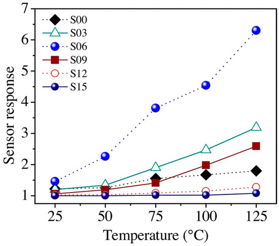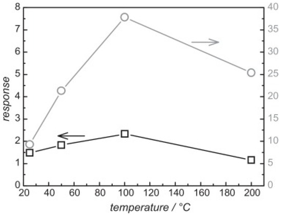 100 ppm formaldehyde sensing results using TiO2 with humidity at 13.68 mg/L vs. working temperatures without UV irradiation. Reproduced with permission from [51].