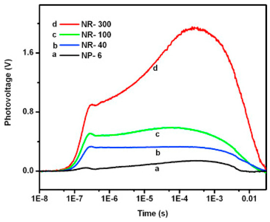 Şahin fabricated vertically aligned ZnO nanorods on indium tin oxide coated glass (ITO) and used this material for NO2 sensing at 200 °C (Figure 29). White light illumination accelerate the response and recovery process during the NO2 sensing. This proposed mechanism behind is the popular photon-induced adsorption-desorption model [12]. Peng studied the size dependence property of ZnO nanorods for sensing formaldehyde in both dark and bright illumination conditions. 6 nm ZnO nanoparticles and nanorods with different diameters (300 nm, 100 nm, 40 nm) were fabricated (Figure 30). Under dark condition, the sensing response increased as the size decrease: 300 nm nanorods < 100 nm nanorods < 40 nm nanorods < 6 nm nanoparticles, as the sensing response was dominated by the surface-to-volume ratio (Figure 31). However, under bright illumination, the 40 nm nanorods exhibited the best sensing response. This was due to photocatalytic reactions, and the sensing response was controlled by both surface-to-volume ratio and photo-generated charge efficiency. Since the photo-generated charge efficiency decreased when the surface-to-volume of the material was increased, which is confirmed by their transient photovoltage (TPV) measurement results (Figure 32), it was important to work out the optimized size to reach a balance for high photo-generated charge efficiency and large surface-to-volume ratio, which was essential for achieving good light-activated gas sensors [13].