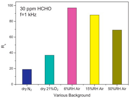 100 ppm formaldehyde UV-activated sensing results for TiO2 vs. humidity at room temperature. Reproduced with permission from [51].