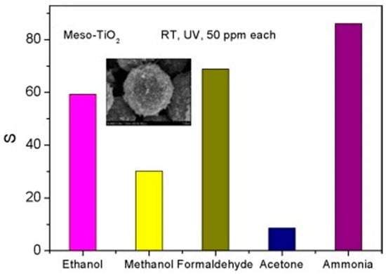 - Zhang, S.; Lei, T.; Li, D.; Zhang, G.; Xie, C. UV light activation of TiO2 for sensing formaldehyde: How to be sensitive, recovering fast, and humidity less sensitive. Sens. Actuator B 2014, 202, 964–970. [Google Scholar] [CrossRef]