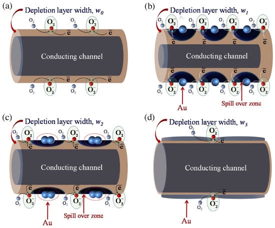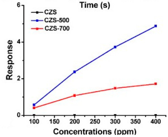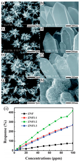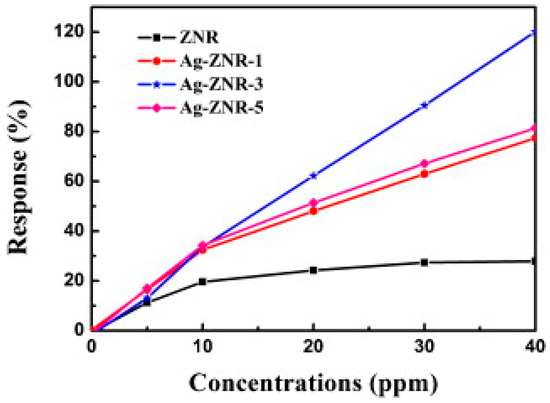 An optimal conductometric gas sensor should meet the requirements of large sensing response, low working temperature and high selectivity to the target analytes. The mechanism for the resistance change of a conductometric gas sensor upon exposure to a gas is due to chemisorption and reaction of gas molecules on surface of the sensing element. Take ZnO, an n-type semiconductor material, as an example, when the material is exposed to air, oxygen in air will be adsorbed on the surface of ZnO and capture electrons from the conduction band of ZnO to form oxygen ion species. Activities of different kinds of oxygen ions are dependent on the working temperature. It is reported that O2− is formed at temperature lower than 150 °C and O−, O2− are formed at higher temperature [21,22,23]. A depletion layer is formed in ZnO, which causes the resistance to increase. Reactions between the oxygen ions and the target gas molecules ultimately lead to the sensor’s signal output. A reducing gas will be oxidized by oxygen ions and released electrons back to the conduction band of ZnO, thus decreases the resistance. An oxidizing gas will be reduced by capturing electrons, thus increasing the sensor’s resistance. After completing the sensing response process, the sensing element can be regenerated by exposing it to air again, as oxygen will be adsorbed on the surface to form oxygen ions again. In the light of this reaction step, the sensing response is highly dependent on several key parameters including working temperature, surface-to-volume ratio, specific surface area, surface active sites, size of the nanostructure and concentration of energetic carriers [24]. The reported schemes for improving the performance of conductometric gas sensors include the use of different nanostructures [25,26,27], controlling the size of nanoparticles [28], combining different materials by synthesizing heterostructures [29] and by doping.