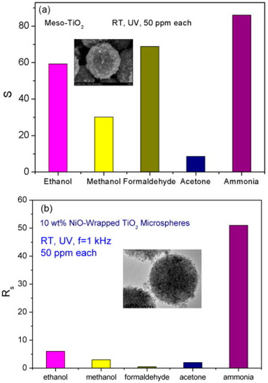 - Li, X.; Chen, N.; Lin, S.; Wang, J.; Zhang, J. NiO-wrapped mesoporous TiO2 microspheres based selective ammonia sensor at room temperature. Sens. Actuator B 2015, 209, 729–734. [Google Scholar] [CrossRef]