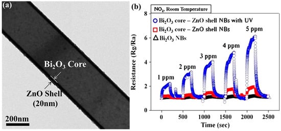 - Park, S.; Ko, H.; Lee, S.; Kim, H.; Lee, C. Light-activated gas sensing of Bi2O3-core/ZnO-shell nanobelt gas sensors. Thin Solid Films 2014, 570, 298–302. [Google Scholar] [CrossRef]