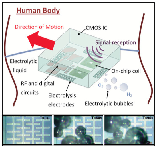 In their 2014 publication [9], Hsieh et al., developed a remote-controlled device with a propulsion mechanism based on gas pressure from electrolytic bubbles that can move at a rate of 0.3 mm/s. Electrolysis electrodes, placed in its four directions, and an electrical current cause electrolysis of the surrounding water, creating micro-bubbles of oxygen and hydrogen which propel the device and are later absorbed by the human body. It was possible to define the electrodes in which the electrolysis would occur and, consequently, steer the device. A previously reported device [10] of this type requires a strong permanent magnetic field to generate the Lorentz forces responsible for movement. Hsieh’s device removed this constraint and took this technology one step closer to real world applications. A representation of the device and a time-lapse of electrolytic bubble formation are presented in Figure 1.
