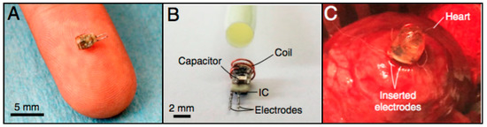 (A) Miniaturized wireless pacemaker on a human finger for scale; (B) device composition, displaying its coil, capacitor and inductive coupling (IC); and (C) an implanted device. Reproduced with permission from [12].