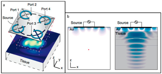 (a) Schematic of the 1.6 GHz midfield power source placed above tissue and the magnetic field on the skin surface; and (b) the resulting magnetic field in air and couple into tissue. Reproduced with permission from [12].