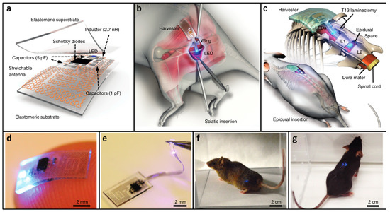 Park et al. [14] developed soft and biocompatible wireless optoelectronic systems, capable of molding to their environment and sustaining natural motions, allowing operation in previously inaccessible places. The proposed device, presented in Figure 4a,d,e, consists of an RF antenna, an RF-DC rectifier and an LED for neural modulation. A representation of implantation of the device is given in Figure 4b,c, and photographs of mice implanted with the device in Figure 4f,g.