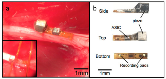 (a) Nervous system recorder placed in the sciatic nerve of a rat and (b) layout of the device. Reproduced with permission from [16].