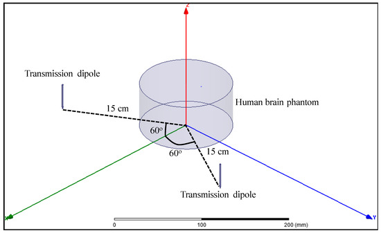 A multipath far-field WPT approach is proposed and validated with Ansys high frequency structure simulator (HFSS) simulations. A model, consisting of a cylinder with the dielectric properties of human brain at 2 GHz was designed, and two 2 GHz half-wavelength dipole antennas were placed one wavelength away from the center of the brain phantom, both at a 60° angle from the symmetry plane, as shown in Figure 7.