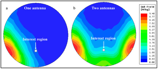 This model was simulated with either both dipoles activated, or only one of them. To keep comparisons as fair as possible, the output power of the transmitting antennas was adjusted, so that the SAR value on the human brain phantom was the same in both scenarios. For one active transmission antenna, an output power of 10.2 W was selected for a maximum SAR value of 9.4 W/kg (averaged over 10 g of tissue). With this, a maximum Poynting’s vector magnitude of 10.9 W/m2 was registered at the selected interest region, given by the square highlighted in Figure 8. For two transmission antennas, outputs of 11.2 W per antenna resulted in the same maximum SAR value, as confirmed by Figure 8a,b. In this scenario, a maximum Poynting vector magnitude of 41.2 W/m2 was registered in the same region of interest, an increase of nearly four-fold in available power in the same region.