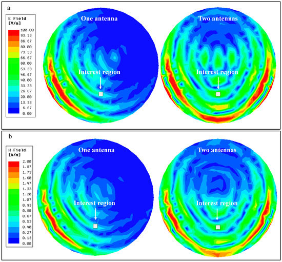 (a) Electric field and (b) Magnetic field distribution in the human brain phantom for one and two transmitting antennas.