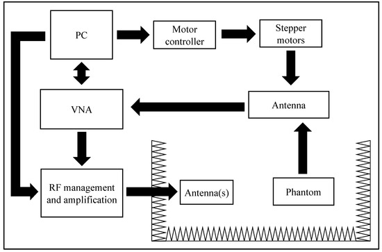 To validate the simulated results, the experimental setup of Figure 10 was developed. A LabView script running on a PC controlled the placement of a receiving dipole antenna inside the liquid phantom through a two stepper motor, while simultaneously controlling a vector network analyzer (VNA) (Keysight E5071C, Keysight Technologies, Santa Rosa, CA, USA). The RF management and amplification block was responsible for allowing easy commutation from operation with one and two transmitting antennas. The power measurement was performed inside an anechoic chamber to reduce interference from external elements.