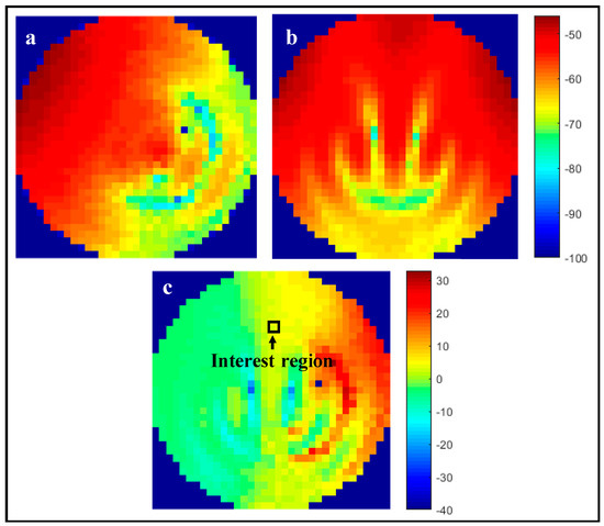 Power distribution inside the human brain phantom for (a) one transmitting antenna; (b) two transmitting antennas; and (c) difference of (a,b).