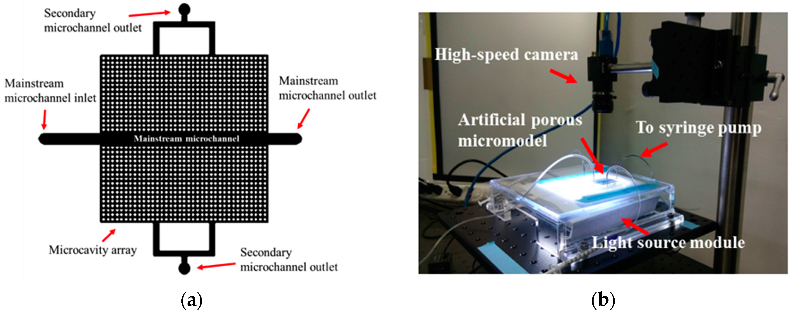 (a) Artificial porous micromodel design to mimic a natural fractured porous material. (b) Photograph of the porous micromodel experimental setup.