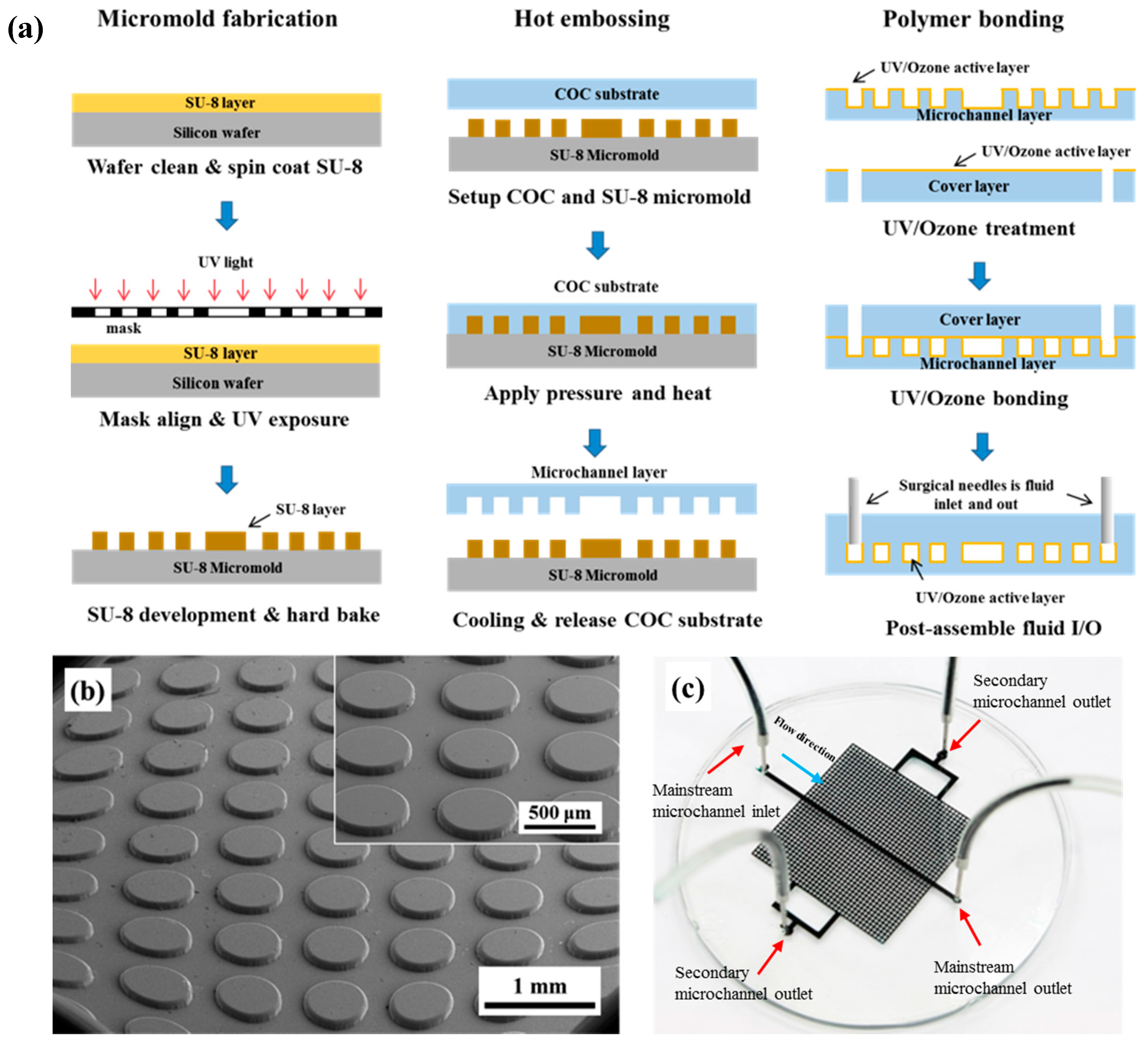 Polymer selection is the first important step in determining the success of microfluidic-chip fabrication for an artificial porous micromodel. In our design, because the micromodel comprises 1332 pieces and 500-μm microcavities, the hydraulic resistance of the microchannel is high. Thus, a high pumping pressure is required to drive the fluid flow. Moreover, a good mechanical strength is required; therefore, an elastomer material such as PDMS is not preferred in this study. A thermoplastic material TOPAS COC 8007 is used herein because of its high mechanical rigidity, low water absorption (0.01%), and good optical transmissivity (91%) for optical observation [35]. The COC-based micromodel fabrication includes three major processes: micromold fabrication, hot embossing, and bonding. As shown in Figure 2a, the micromold is first fabricated using the standard SU-8 photolithography process. Figure 2b shows the SEM image of the microcavity arrays on the SU-8 micromold.