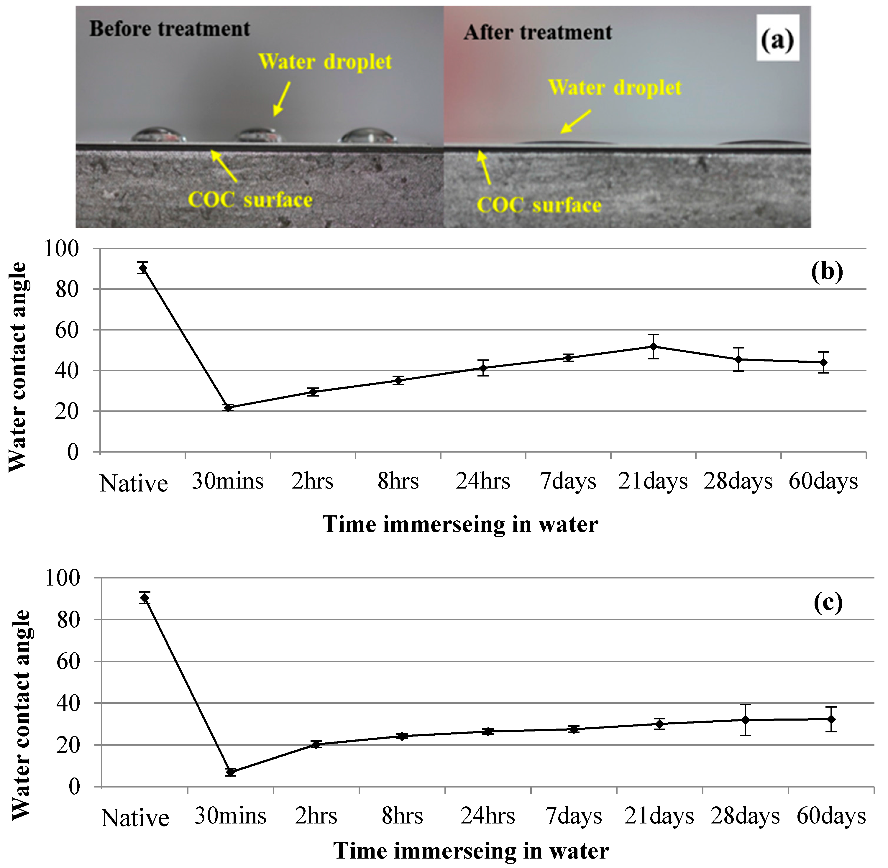 (a) Change in the COC-surface wettability after UV/Ozone treatment. The COC-surface water contact angle at different water-immersion times after (b) 100 s and (c) 300 s of UV/Ozone surface treatments.