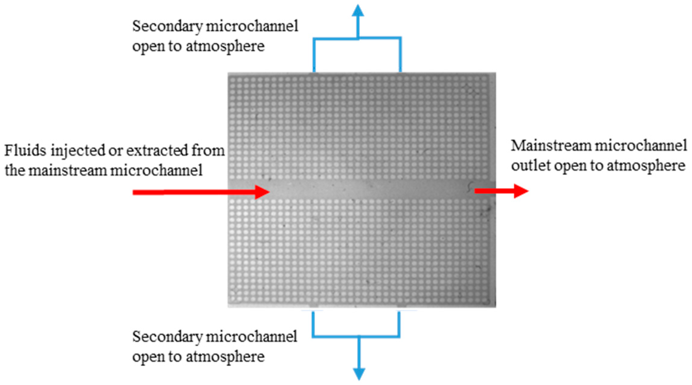 The artificial pattern represents a two-dimensional cross-section of a fractured pore material. The inlet and outlet of the mainstream microchannel represent the injection and extraction points of water and oil during groundwater remediation or enhanced oil recovery, respectively. The secondary outlets represent another parallel fracture connected to air or another extraction well away from the main fracture. They allow the displaced fluid to flow in the direction perpendicular to the main flow direction.