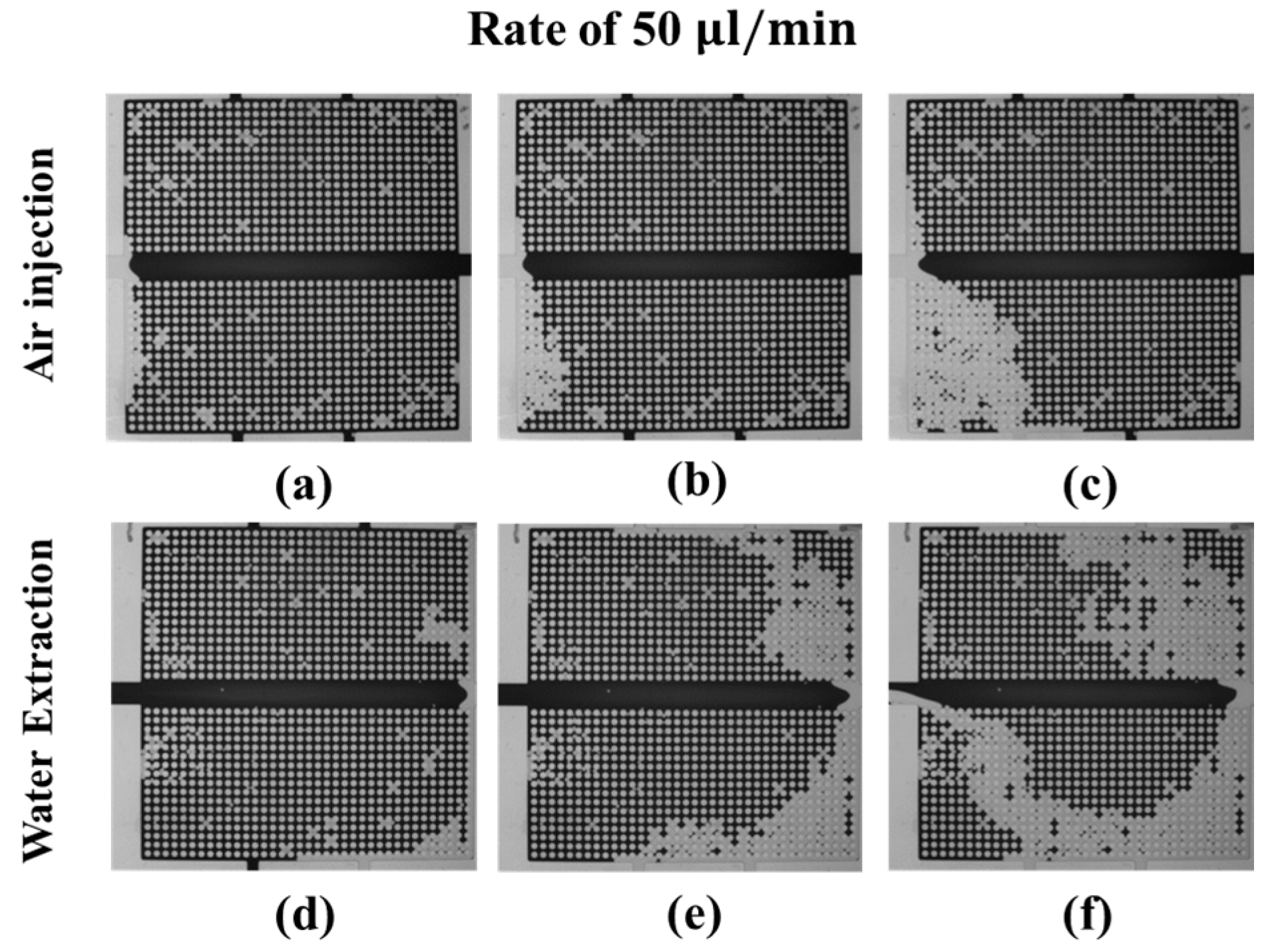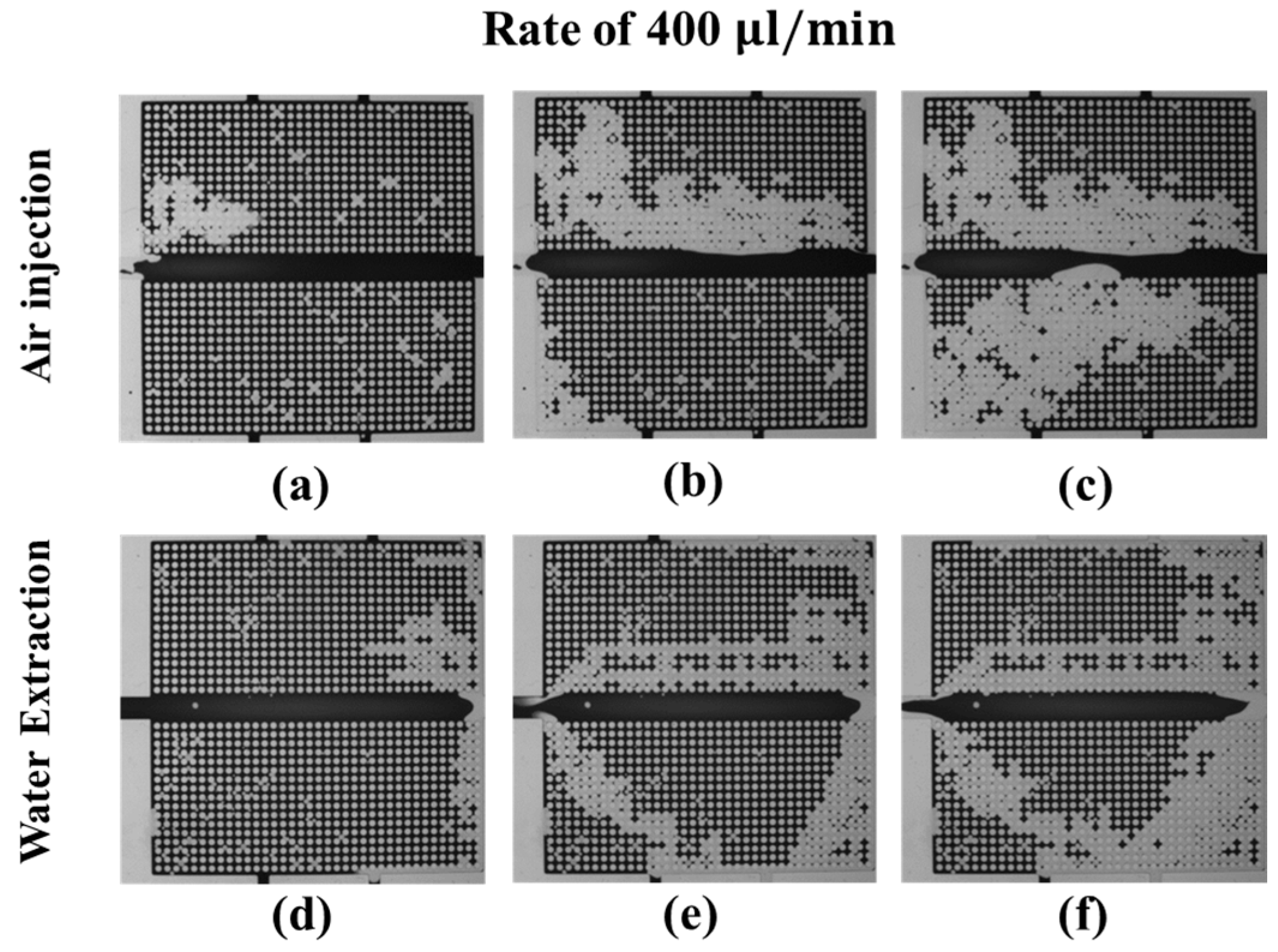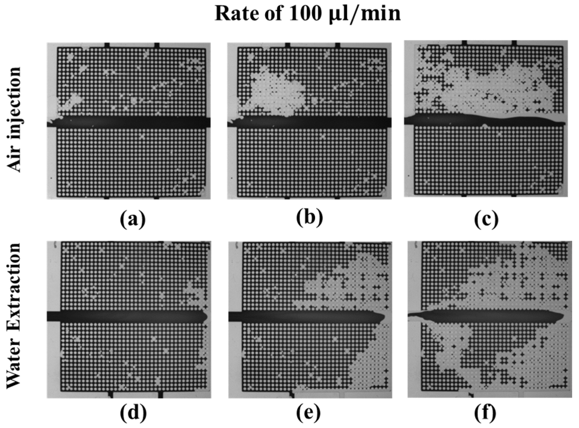 The dynamics of the water (dark)-air (transparent) distributions during the drainage process at an air injection (a–c) and water extraction (d–f) rate of 200 μL/min. (a,d) correspond to the beginning of the drainage process, (b,e) the middle of the drainage process, and (c,f) the end of the drainage process.