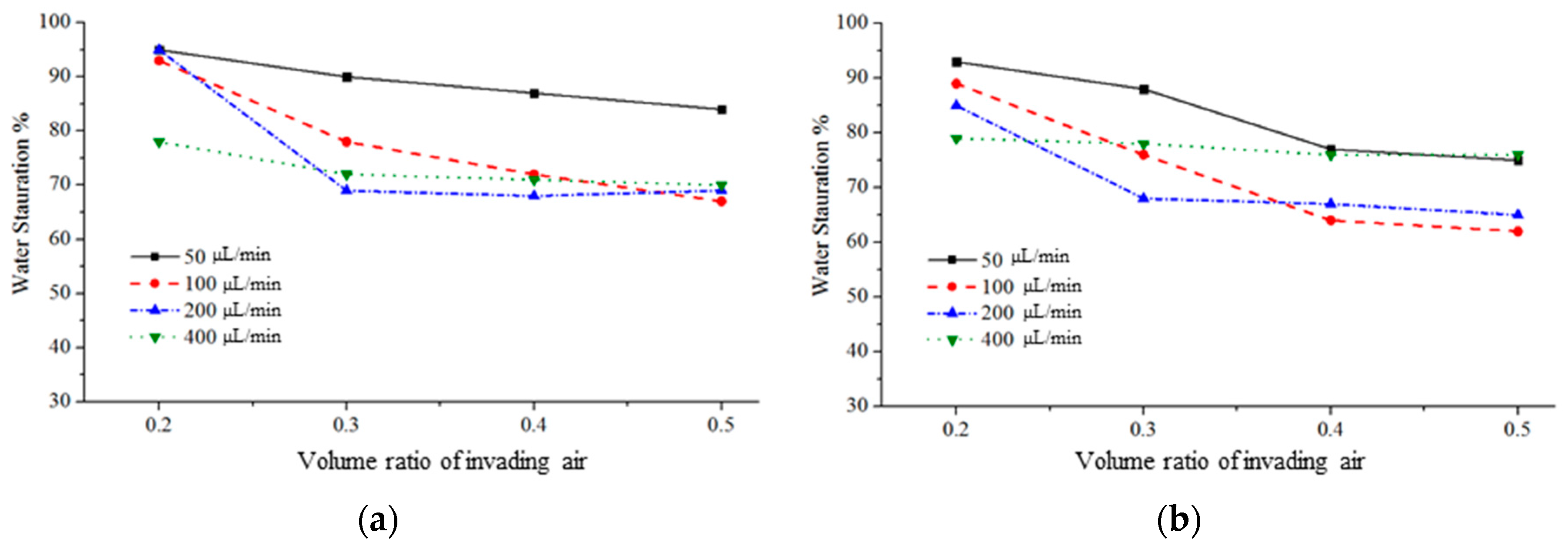 Water saturation versus the volume ratio of invading air in the models with (a) different air injection rates and (b) different water extraction rates.