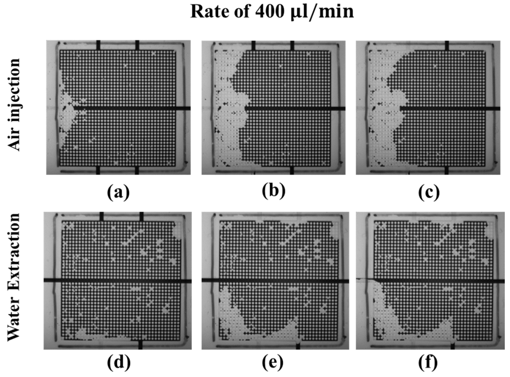 In Figure 8a–c, the air pushes out the dyed water in the upper microarray and then the lower microarray. When the injected air flows out via the right outlet, the water distribution in the upper microarray quickly reaches a steady state; then, the air pushes water in the bottom microarray. At the end of the experiment, the injected air pushes out more than 50% of the water in both the upper and lower microarrays, as shown in Figure 8c. For water extraction from the left inlet, the air first moves into the micromodel via the right outlet and drains the upper microarray and the lower microarray, as shown in Figure 8d. In the middle of the water extraction, the air uniformly drains the water in the upper microarray and forms a preferential pathway connecting the right and bottom outlets in the lower microarray. At the end of the experiment, all the air from the outlets flows out via the water extraction inlet, and the water distribution in the micromodel becomes steady, as shown in Figure 8f.