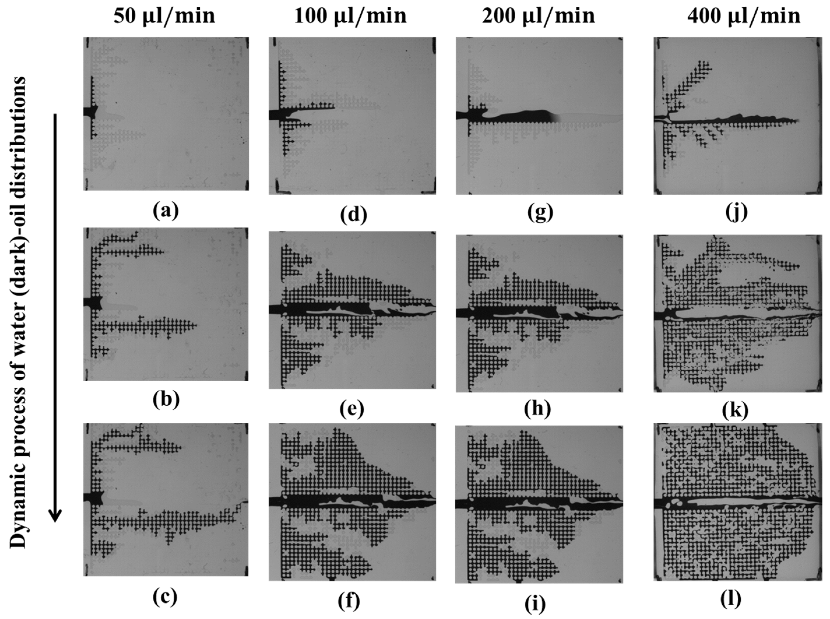 Dynamics of the water (dark)–oil (transparent) distributions during the imbibition process at water-injection rates of 50 μL/min (a–c), 100 μL/min (d–f), 200 μL/min (g–i), and 400 μL/min (j–l) in a micromodel. (a,d,g,j) correspond to the beginning; (b,e,h,k) to the middle; and (c,f,i,l) to the end of the imbibition process.