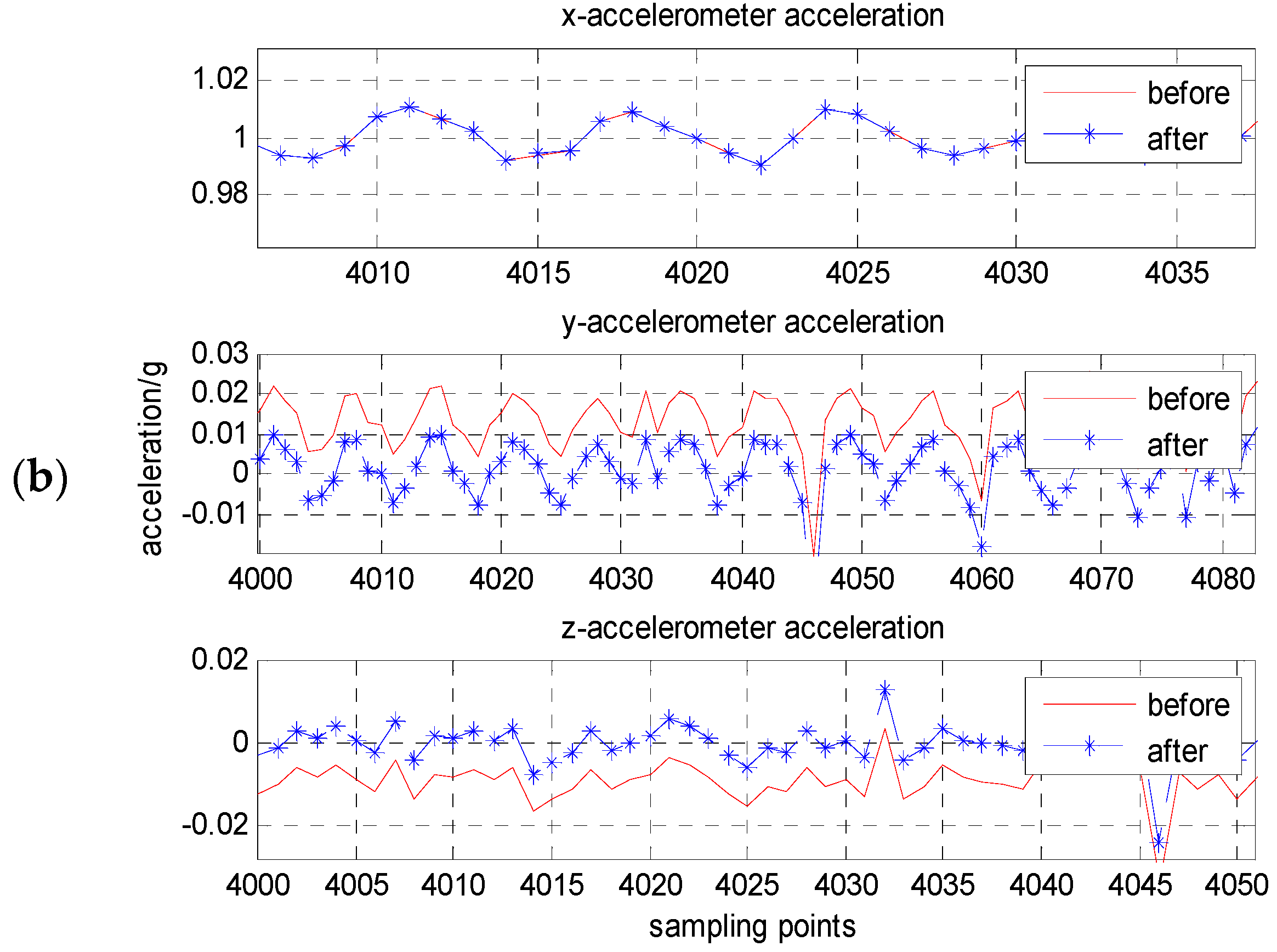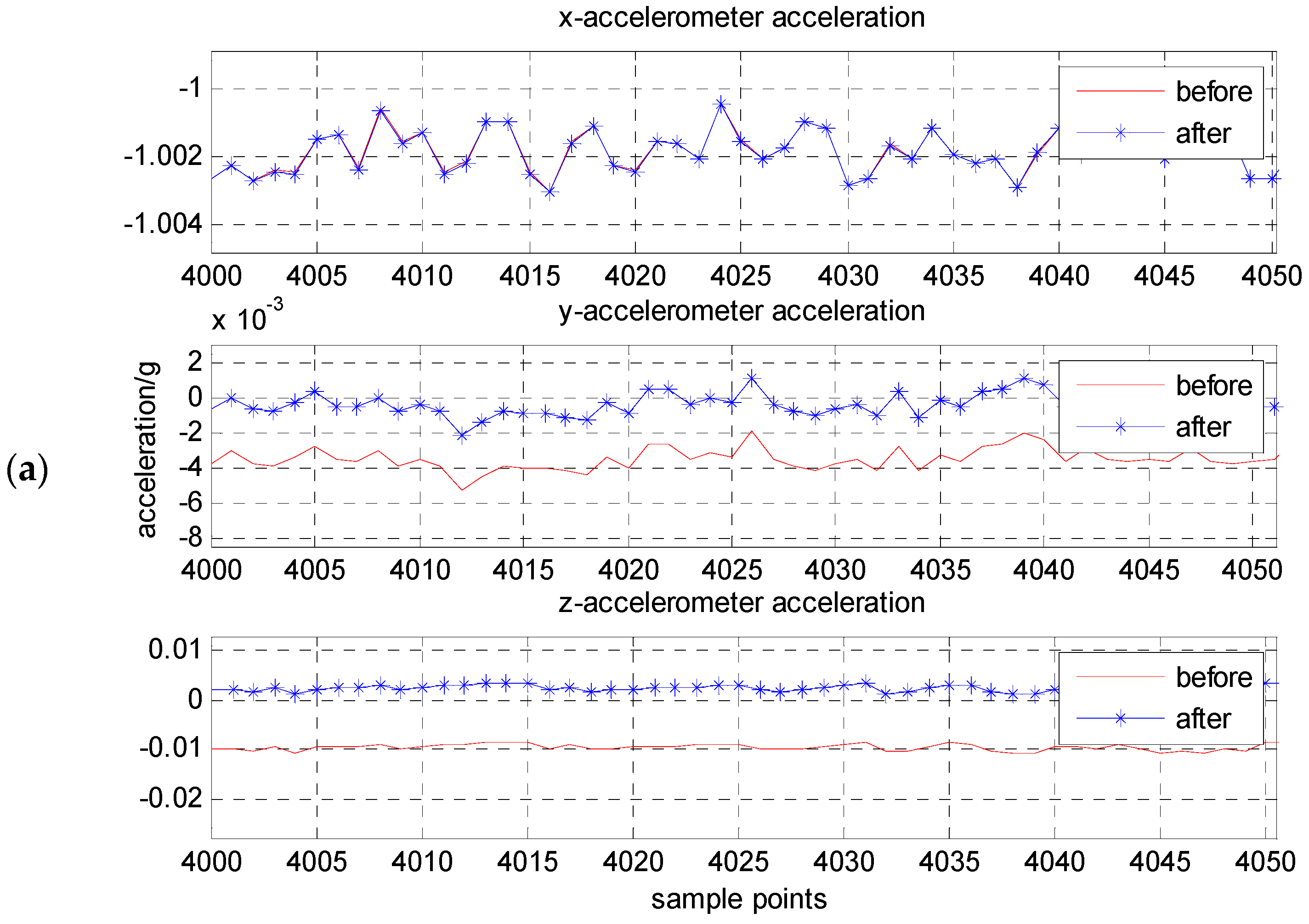 - According to static parameters calibration model Equation (6), the least squares fitting results can be obtained by using Matlab (version 7.8.0 (R2009a), MathWorks, Natick, MA, USA), which are actual installation angle, zero bias and scale factors of tri-axial accelerometers, respectively.