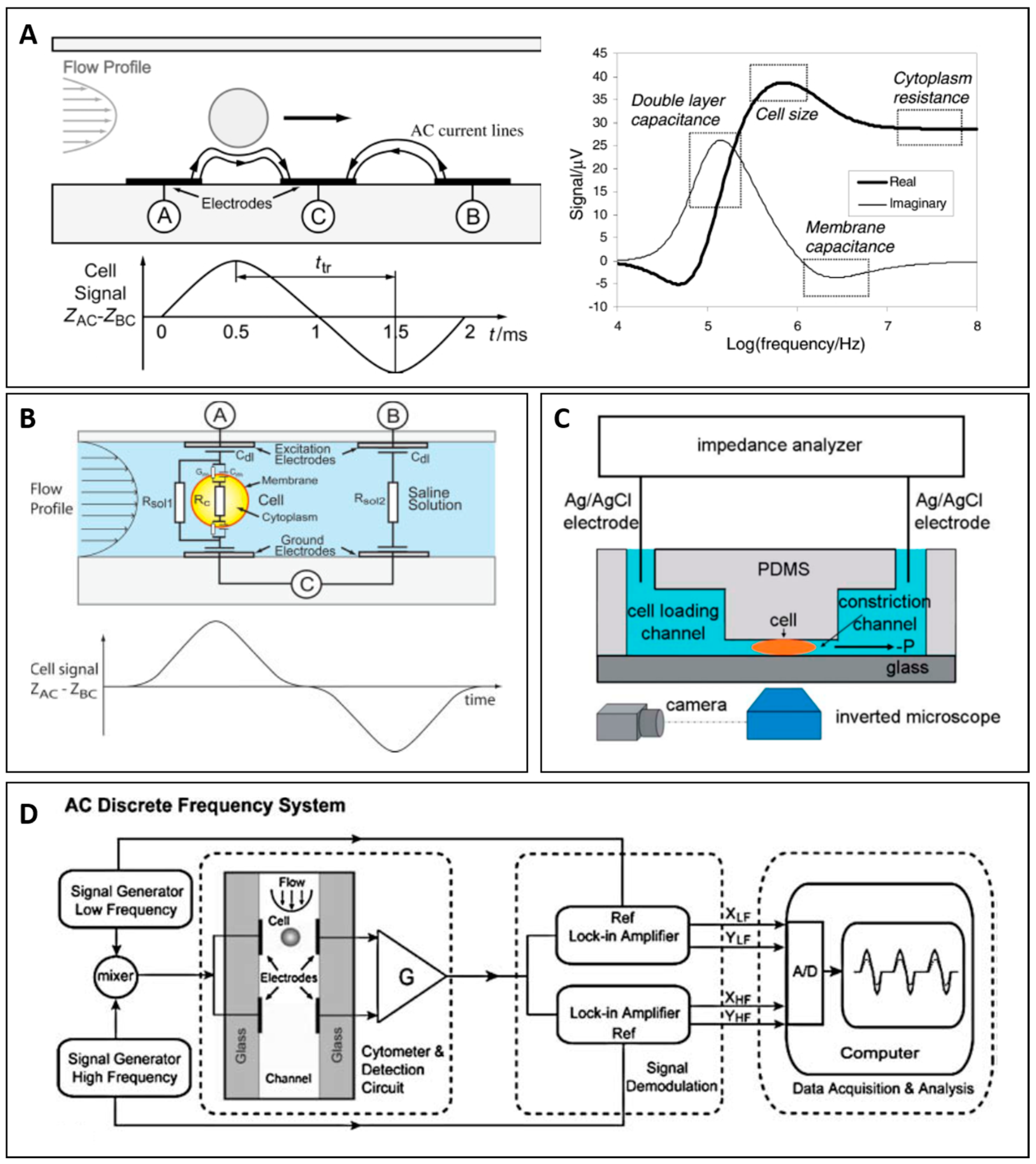 In this section, we describe three common configurations used in impedance based microfluidic cytometry: coplanar electrodes, parallel electrodes, and constriction channel. Figure 1A–C shows microfluidics impedance cytometers using coplanar electrodes design (Figure 1A), parallel electrodes design (Figure 1B), and constriction channel design (Figure 1C). Each design is based on a similar detection principle, with excitation electrode and sensing electrodes embedded inside microfluidic channel to establish electrical measurement. As a cell flows between a pair of electrodes (A and C), the electric field between these two electrodes is disrupted, resulting in a current change that can be measured at point A. The current measured at this position corresponds to the impedance of cell and its suspending medium. To determine impedance of medium, the current at point B is also acquired simultaneously and the impedance of cell can be acquired from the difference between current at point A and at point C (Figure 1A). Typically, the setup consists of pre-amplifier, lock-in amplifier and data acquisition system (Figure 1D). The excitation signal is supplied to excitation electrode by function generator or lock-in amplifier, and sensing electrodes are connected to bridge circuit or trans-impedance amplifiers to measure current response of system. The amplifiers’ output is connected to lock-in amplifier to demodulate current signal at excitation frequency. The data are sent to data acquisition system for post processing.