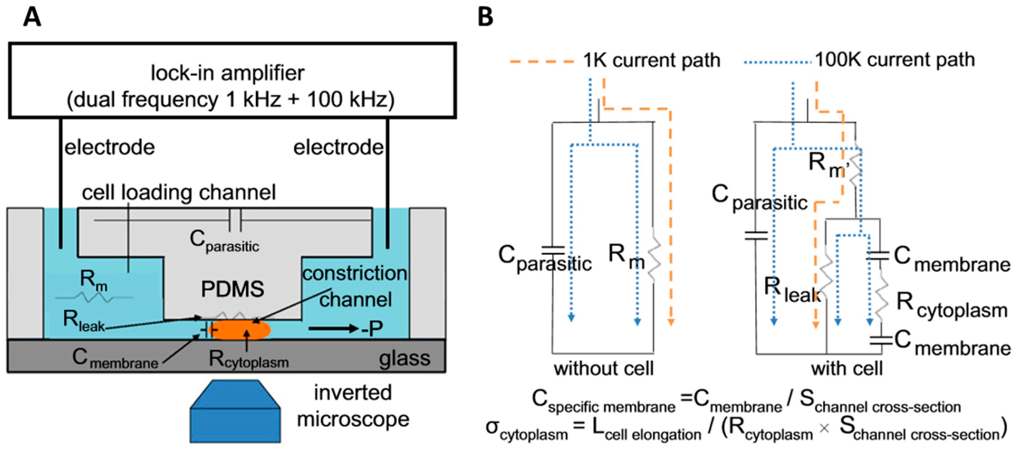 - Zheng, Y.; Shojaei-Baghini, E.; Wang, C.; Sun, Y. Microfluidic characterization of specific membrane capacitance and cytoplasm conductivity of singlecells. Biosens. Bioelectron. 2013, 42, 496–502. [Google Scholar] [CrossRef] [PubMed]