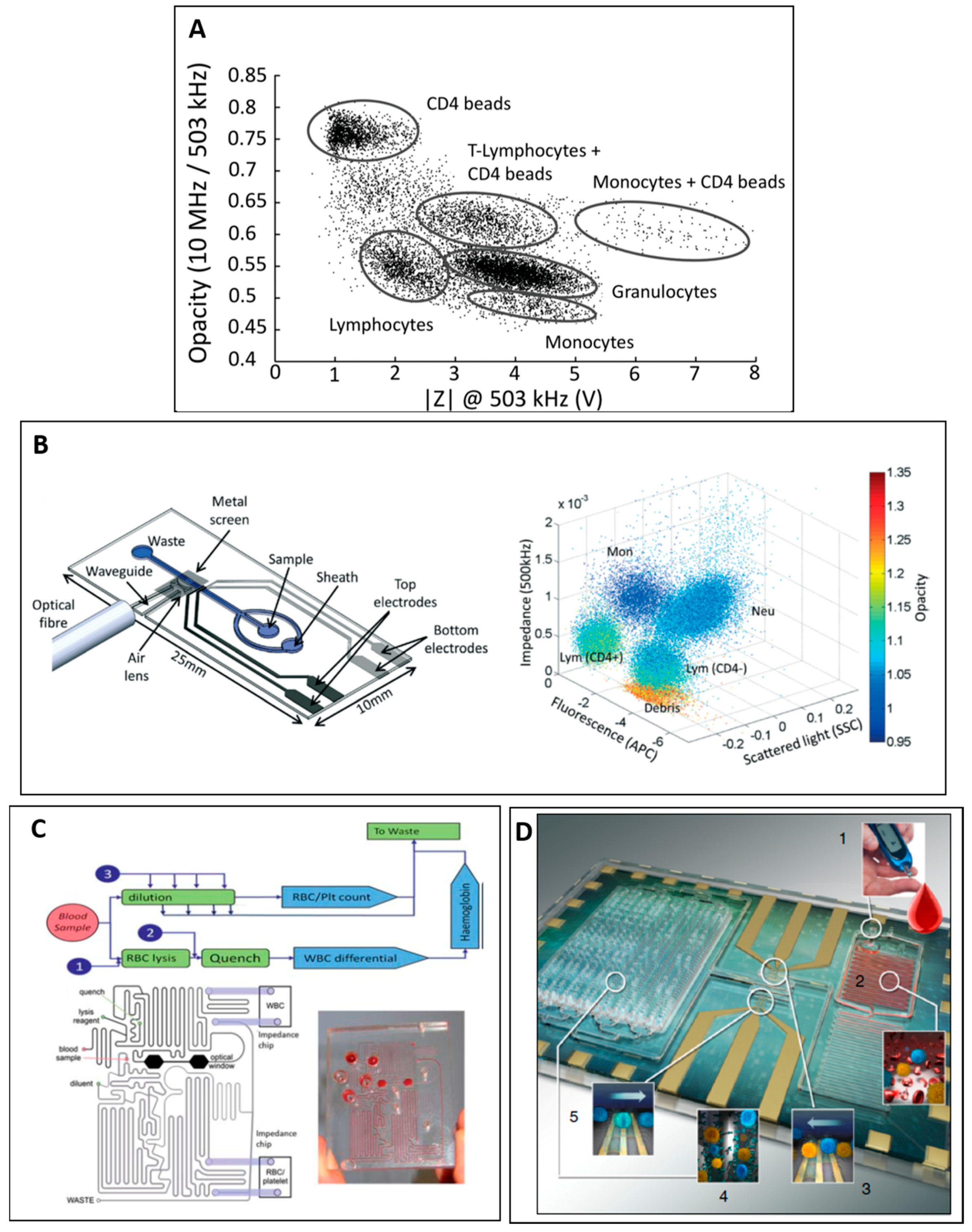 Holmes et al. proposed impedance labelling technique for counting of CD4+ T-cells [53]. Anti-CD4 antibody coated beads (1.8–2.4 µm) were mixed with lysed whole blood and bound to the monocyte and CD4 expressing (CD4+) T-cells. As a result, the population of CD4+ cells were larger due to the beads bounded on their surfaces, resulting in an increase in opacity (10 MHz and 0.5 MHz) and impedance signal at 0.5 MHz (Figure 4A). This method of using impedance labelling enables enumeration of sub-population. Spencer et al. also described a novel sheathless microfluidic cytometer with on-chip waveguide (Figure 4B (left)) that can measure four parameters: fluorescence signal, large angle side scatter and impedance at two different frequencies (0.5 MHz and 2 MHz) (Figure 4B (right)).