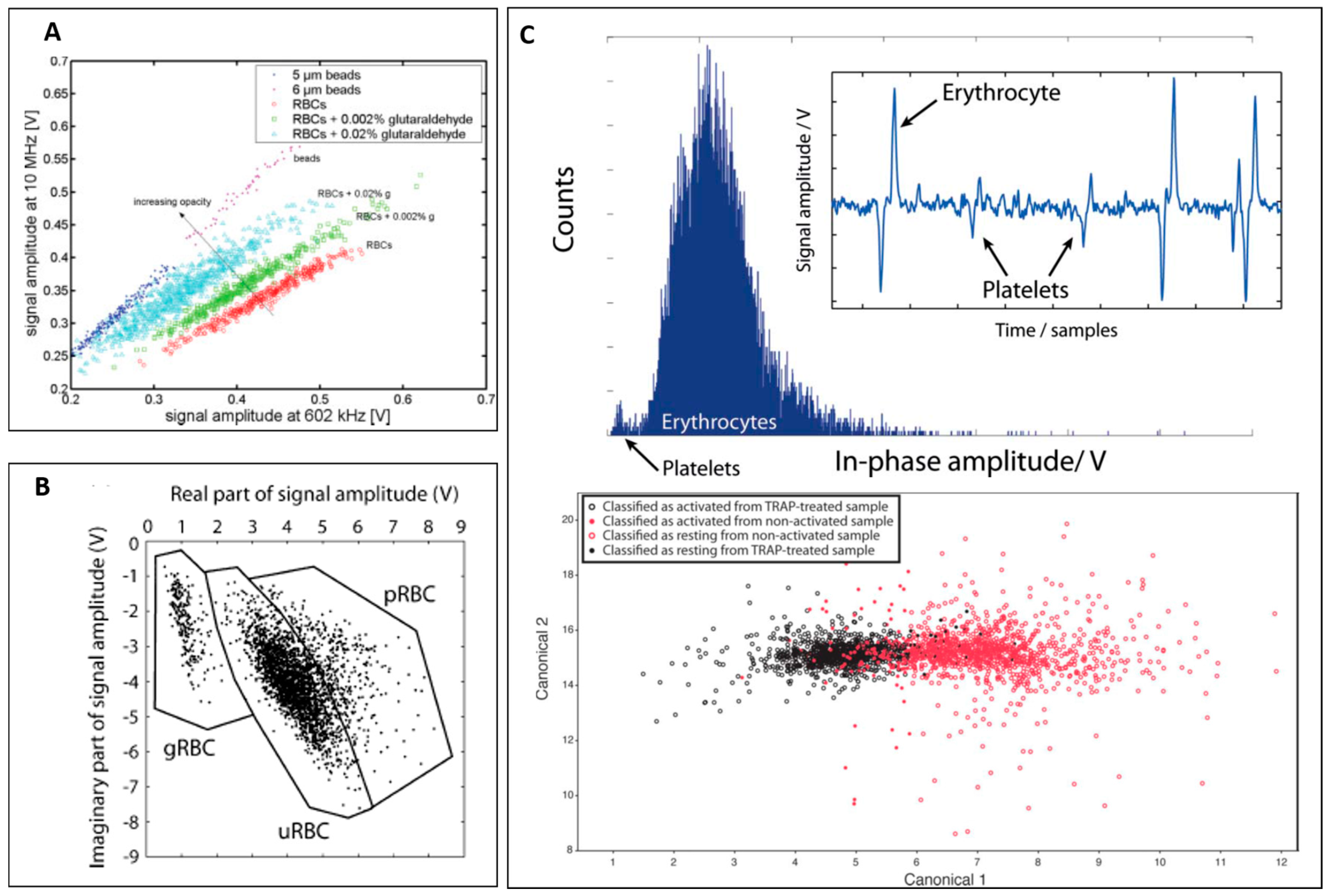 For platelet analysis, Evander et al. demonstrated the detection of red blood cells and platelets as shown in Figure 5C (top) [40]. Moreover, the group also successfully classified non-activated platelets from thrombin receptor activating peptide (TRAP) activated platelets based on discriminant analysis from impedance signal at four frequencies (284 kHz, 1.20 MHz, 2.39 MHz and 4.02 MHz), which will be useful to study thrombosis or platelet dysfunctions (Figure 5C (bottom)).