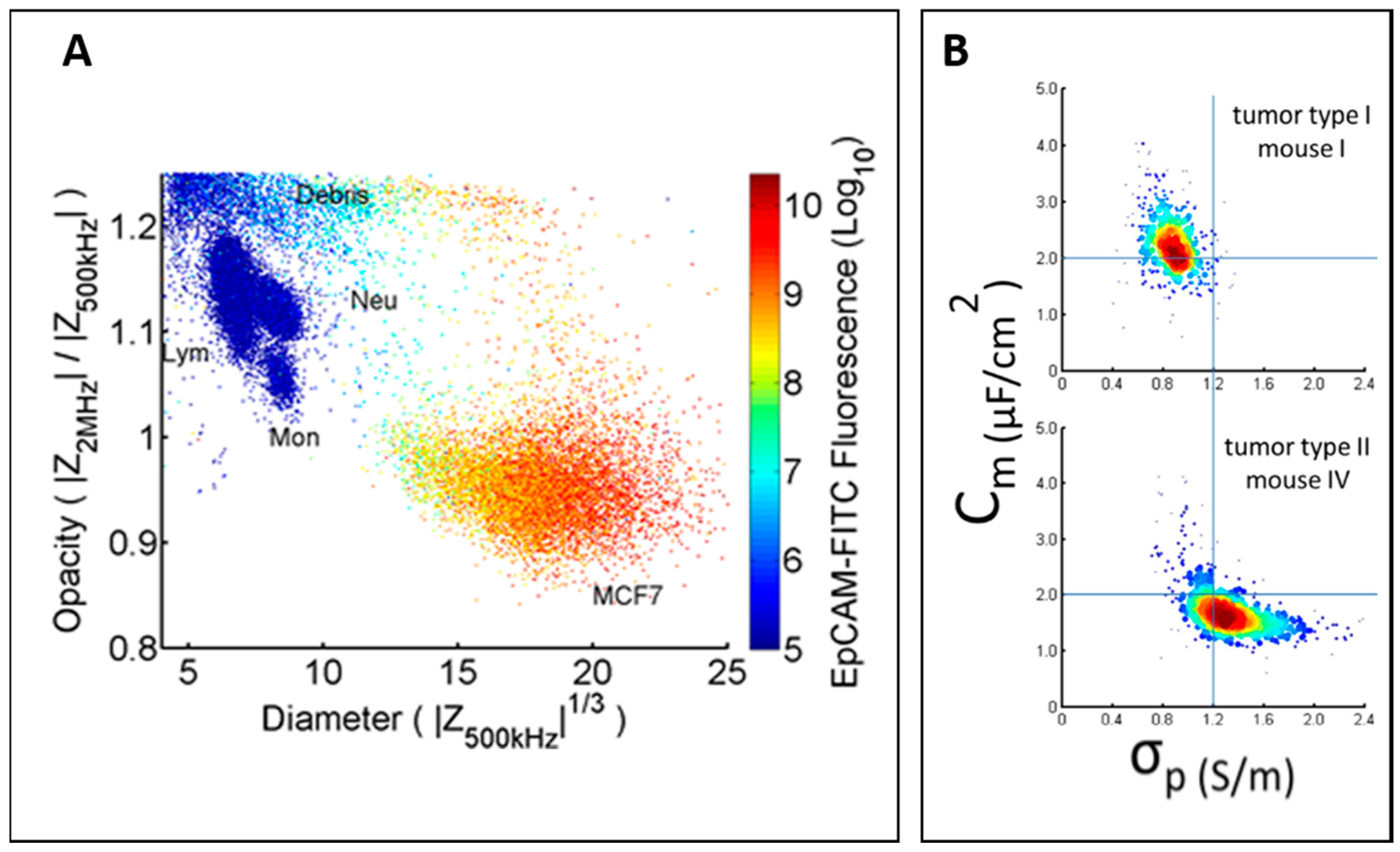 (A) Scatter plot of opacity (2 MHz/500 kHz) and diameter (impedance signal at 500 kHz) for leukocytes and MCF7 cells. Colour represents fluorescence signal. Reproduced with permission from [76], copyright 2014, AIP Publishing LLC. (B) Scatter plot of Cspecific membrane versus σcytoplasm for A549 (mouse I) and H1299 (mouse IV). Reproduced with permission from [78], copyright 2016, Nature Publishing Group;