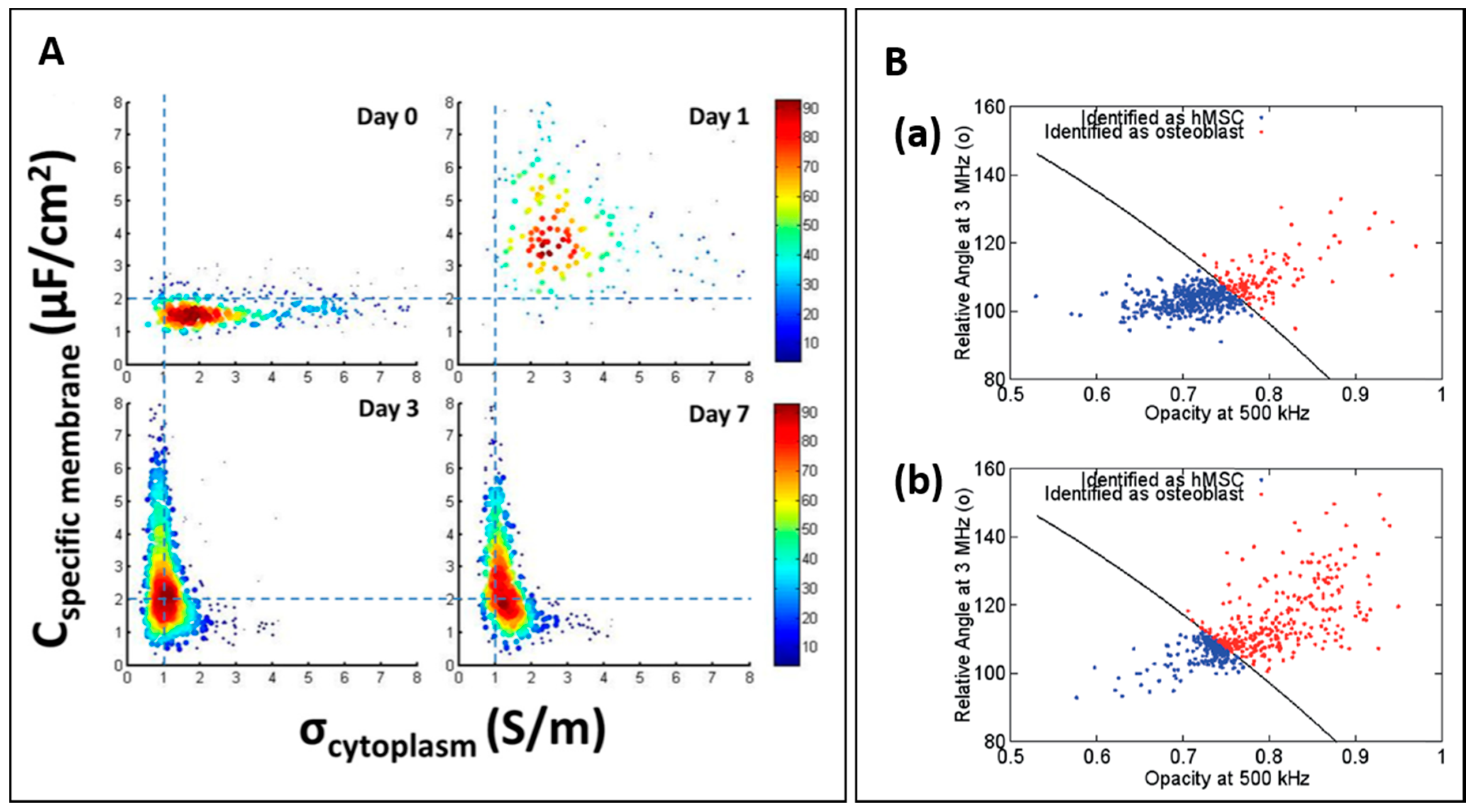 (A) Scatter plot of Cspecific membrane versus σcytoplasm of cultured neural stem cells for different days. Reproduced with permission from [84], copyright 2016, Public Library of Science. (B) Classification results of human mesenchymal stem cells (hMSC) and osteoblast measured at: seven days (a); and 14 days (b). Reproduced with permission from [85], copyright 2016, Royal Society of Chemistry;