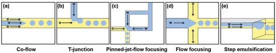 Water-in-oil (w/o) emulsions are obtained by dispersing an aqueous phase into an immiscible carrier oil phase, usually supplemented with a surfactant molecule to stabilize the emulsion (see Section 4). However, because of the laminar flow adopted by liquids circulating within a microfluidic device, simply flowing the continuous (oil) and the dispersed (aqueous) phases together in a channel is not enough to generate droplets of controlled volume. Instead, the production of highly monodisperse emulsions (less than 5% of variation in droplet volumes) requires the use of well-defined geometries, eventually producing fL to nL droplets. Many geometries and strategies have been developed over the last years. Whereas an exhaustive introduction of these systems can be accessed elsewhere [40], the main strategies are summarized on Figure 2.