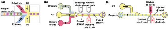 Finally, addition of reagents to surfactant-stabilized droplets can also be performed by the direct injection of the solution into circulating droplets [89] (Figure 3c). In a droplet picoinjector, a solution is delivered to the droplets while they pass in front a pressurized injection channel subjected to an electric field that transiently destabilizes the droplet/aqueous solution interface. Even though this module can be prone to hydrodynamic instabilities, the implementation of an upstream pressure stabilizer was found to greatly improve its reliability [90].