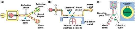 Main droplet sorting strategies. (a) Microfluidic droplet sorting using droplet deflection. Droplets are reinjected into a sorting device and spaced by an oil flow. Droplet content (e.g., fluorescence) is analyzed at a detection point (blue arrow) and a deflection device (e.g., pairs of electrodes, surface acoustic wave generator, piezoelectric component…) is activated accordingly to deflect the droplets of interest (green) into the collection channel. (b) Droplet sorting based on droplet fusion with an aqueous phase. Droplets are reinjected into the sorting device and spaced by an oil flow. Droplet content (e.g., fluorescence) is analyzed at a detection point (blue arrow) and a pair of electrodes is activated to fuse the droplet of interest with a continuous aqueous flow (blue) accordingly. (c) FACS-based droplet sorting. Water-in-oil-in-water droplets are carried by a sheath fluid (blue), analyzed and sorted by FACS.