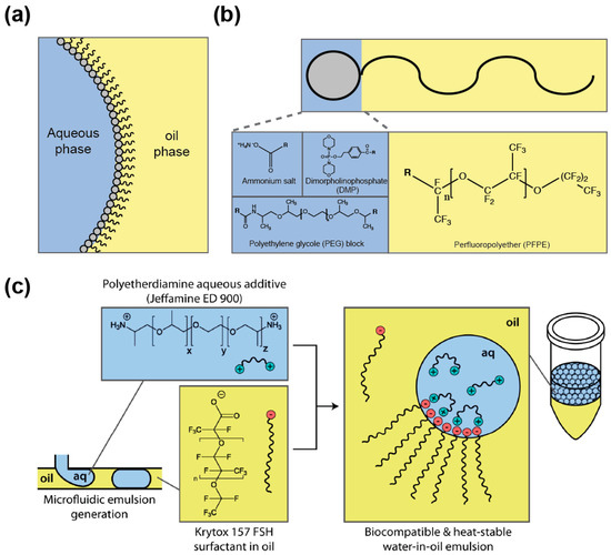 Dispersing an aqueous medium into an immiscible oil phase allows producing droplets whose interface is subjected to a high surface tension. As a consequence, droplets tend to coalesce to minimize oil/water surface area, a phenomenon that disrupts genotype/phenotype linkage. Nevertheless, droplet stability can be preserved by supplementing the oil phase with a “surface active agent” (or surfactant). Surfactants are amphiphilic molecules composed of different groups having affinity for each phase (oil and aqueous) and that are able to reduce the surface tension by partitioning at the oil/aqueous interface (Figure 5a). Once at the interface, the surfactant was proposed to prevent droplet coalescence by steric hindrance as well as by the establishment of a Marangoni flow, counteracting the oil drainage between droplets contacting each other [109]. A variety of oils and surfactants can be used as reviewed elsewhere [109,110] and, whereas IVC protocols usually employ non-fluorinated oils [111], nowadays droplet-based microfluidic approaches mainly use fluorinated carrier oils (e.g., FC40 and Novec 7500) since they both limit droplet–droplet molecular exchanges, as organic molecules are poorly soluble in these oils [112], and they are well compatible with PDMS (avoiding PDMS swelling [113] as mineral oil would [52]). In addition, fluorinated oils efficiently dissolve respiratory gases [114], a particularly interesting feature when cells need to be grown in the droplets. Most of the fluorinated surfactants are based on the perfluorinated polyether (PFPE) Krytox™ (Figure 5b) that possesses a carboxylic head group. However, the ammonium salt of the molecule has poor biocompatibility [115], a key parameter that can be efficiently assessed using cell-based [115] or in vitro gene expression [116] assays. The toxicity of Krytox™ was likely due to the nature of the counter cation used, since a recent study showed that the addition of free polyetherdiamine in the aqueous phase (Figure 5c) restores the biocompatibility of droplets stabilized by Krytox™ [117]. However, most of the surfactants used nowadays consist of PFPE tails covalently conjugated with polar heads like dimorpholinophosphate [115], polyethylene glycols [118], or polyetherdiamine [71]. Several of these block co-polymers are now commercially available (e.g., from RAN biotechnologies (Beverly, MA, USA) or Sphere Fluidics (Cambridge, UK)) which eases the access to the technology. Furthermore, since surfactant toxicity may be due to non-specific adhesion to surface, additives such as Pluronic®, can be added to the aqueous phase to limit adsorption of cells or molecules [119].